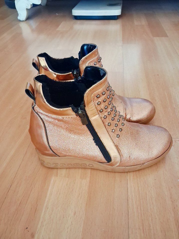 Bu kadın botları, dolgu topuk ve parlak altın renkli deri malzemeye sahiptir. Tokalı detaylarıyla sokak stiline uygun, günlük kullanım için rahat ve şık 37 37.5 da olur bir iki soyulma teri boyandı