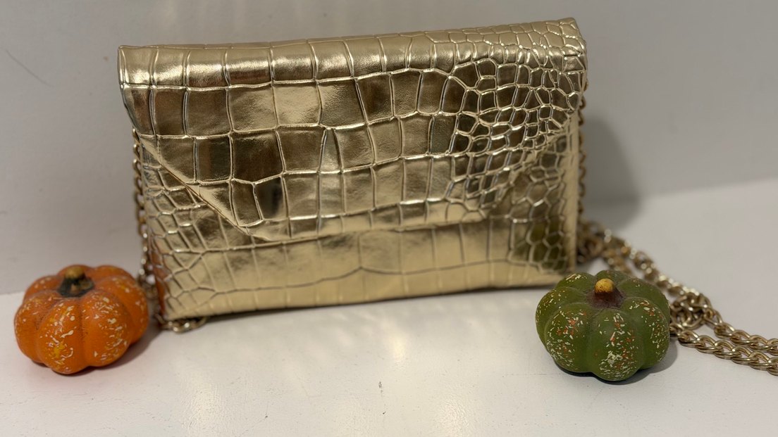 Parlak altın renkli deri yılan desenli kadın clutch çanta, fermuarlı kapanışa sahip, klasik şıklık ve çağdaş tarzı romantik akşamlar için birleştirir. ✨