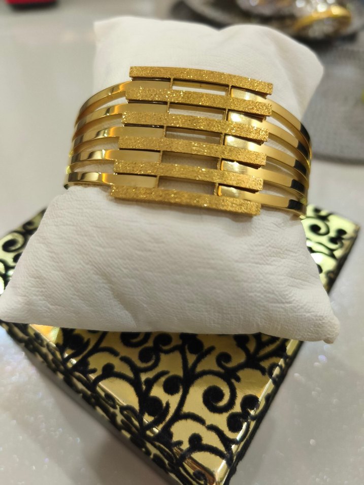 Parlak altın renkli, desenli ve tokalı çağdaş tasarımlı kadın bileklik, klasik zarafet için günlük kullanıma uygundur. ✨