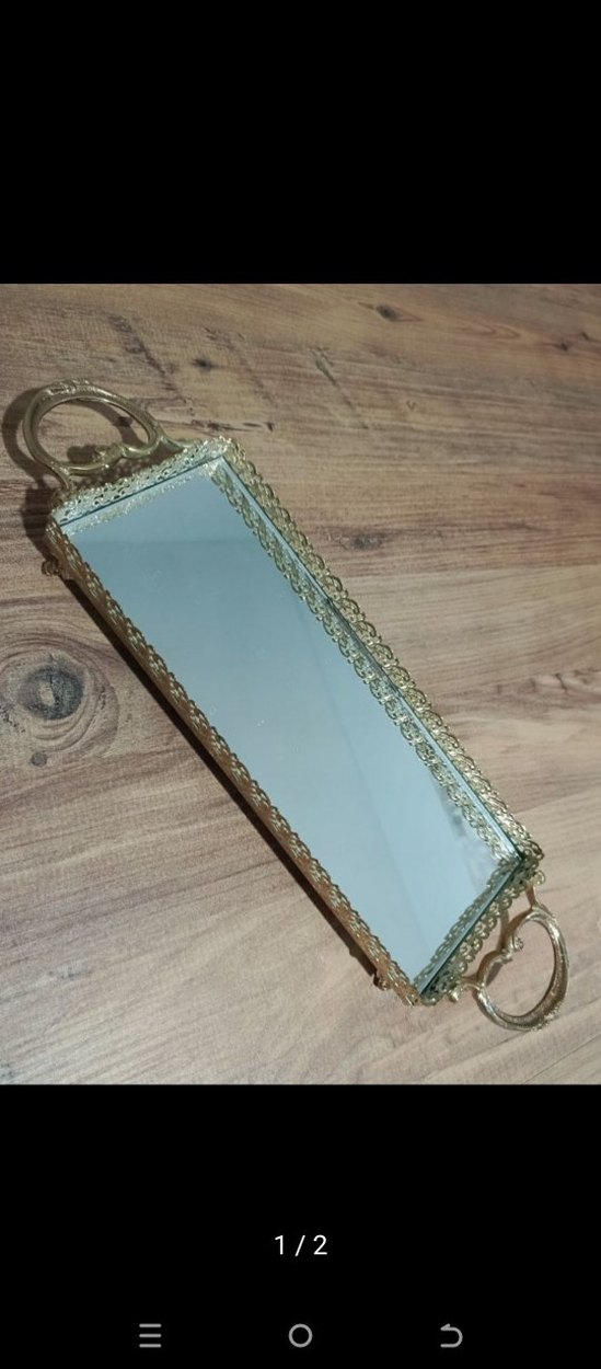 Parlak altın renkli dikdörtgen ayna, süslü kulplar ve zarif bir çerçeveye sahiptir.Çok amaçlı dekoratif tepsi.