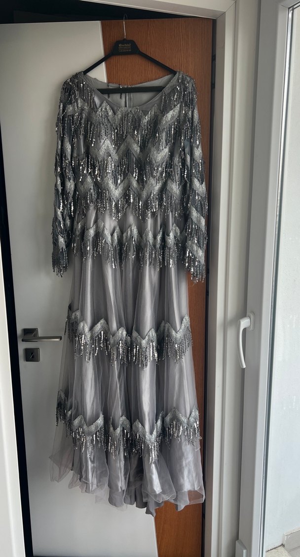 Altın Renk Parlak Drapeli Uzun Abiye Elbise