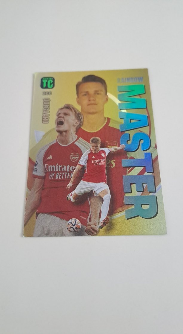 Parlak altın renkli erkek rozeti, pop kültür tarzında futbolcu görselleri ve canlı renkler içerir. MASTER ve Emirates yazıları bulunur. ⚽