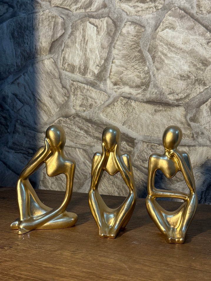 Parlak yüzeye sahip, farklı pozlardaki soyut insan figürlerini temsil eden üçlü altın renkli figürin seti. Modern tasarım ve pürüzsüz yüzey.