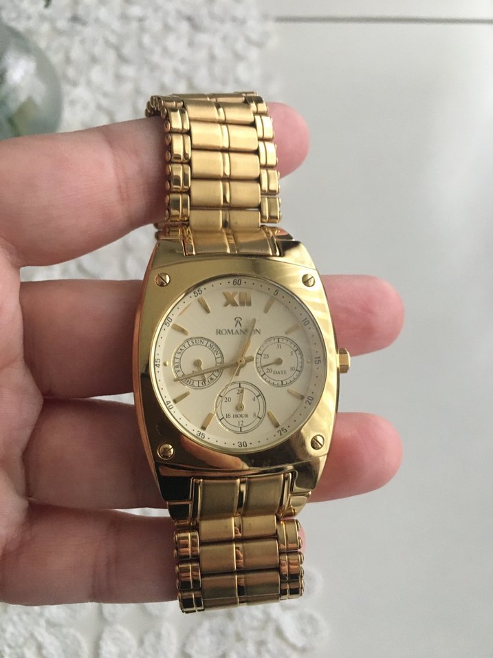 Parlak altın renkli, kemerli kayışa sahip kadın saati. Klasik yuvarlak kadranıyla nostaljik ve sokak modası tarzı bir arada.arkasında yazı vardı sildirdim