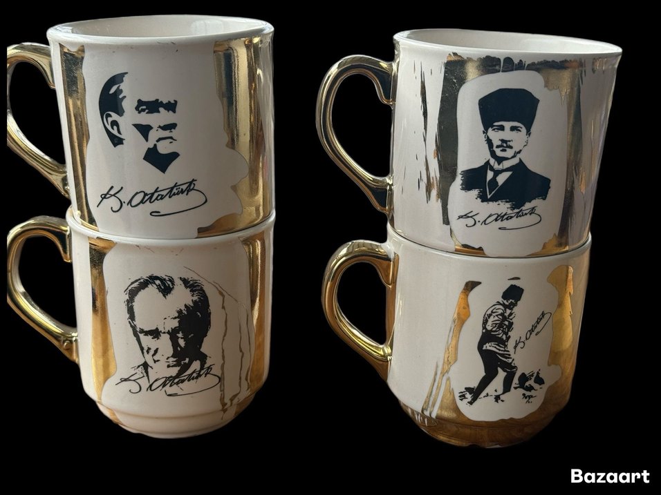 Parlak altın kulpları ve detayları olan, siyah beyaz portreler ve imzalar içeren seramik kupa seti. Sıcak içecekler için uygundur. ☕ Atatürk desenli 1 adet ister set halinde