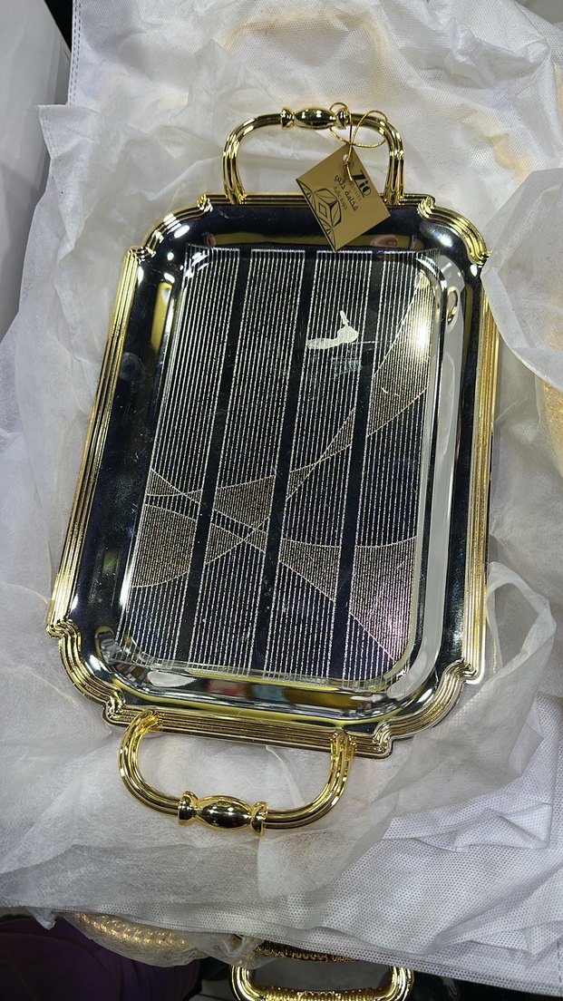 Parlak altın renkli, kulplu bir servis tepsisi. Dokulu ve desenli yüzeyiyle şık bir görünüm sunar. ️Üç Adettir küçük orta ve büyük