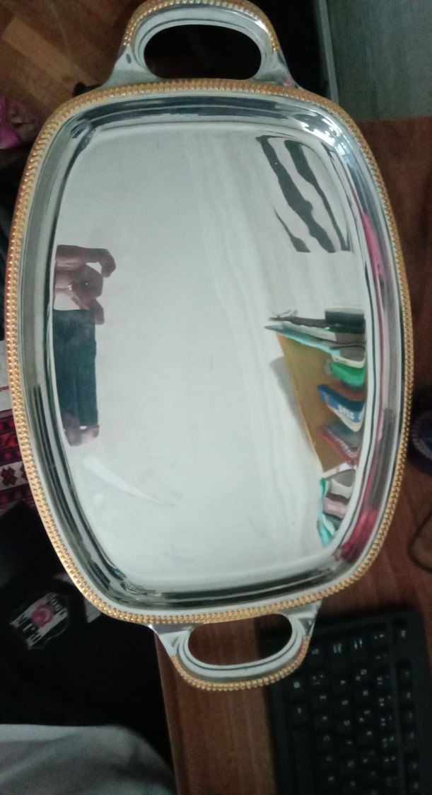 Parlak yüzeyli, kulplu altın renk tepsi, dekoratif kenar detayına sahip. Sunum ve servis için uygundur. ️Çeliktir hiç kullanılmadı sandıktan cikardim