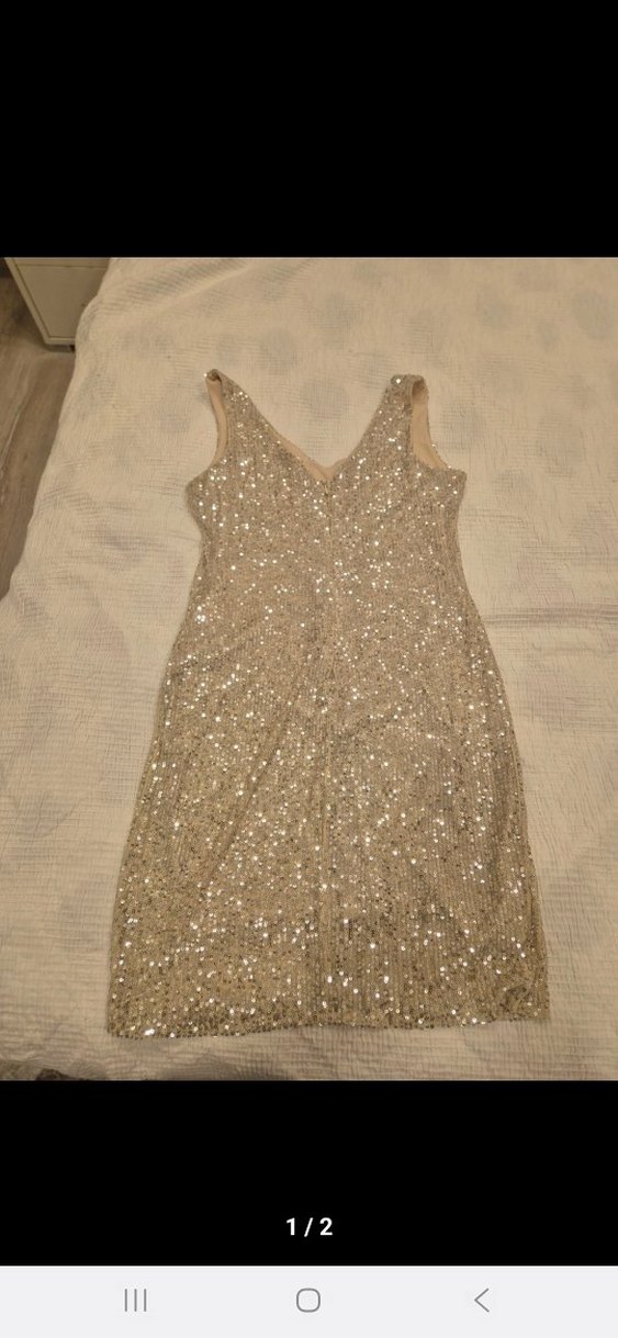 Altın renk, V yakalı, kolsuz, midi boy payetli ve vücuda oturan parlak parti elbisesi. ✨