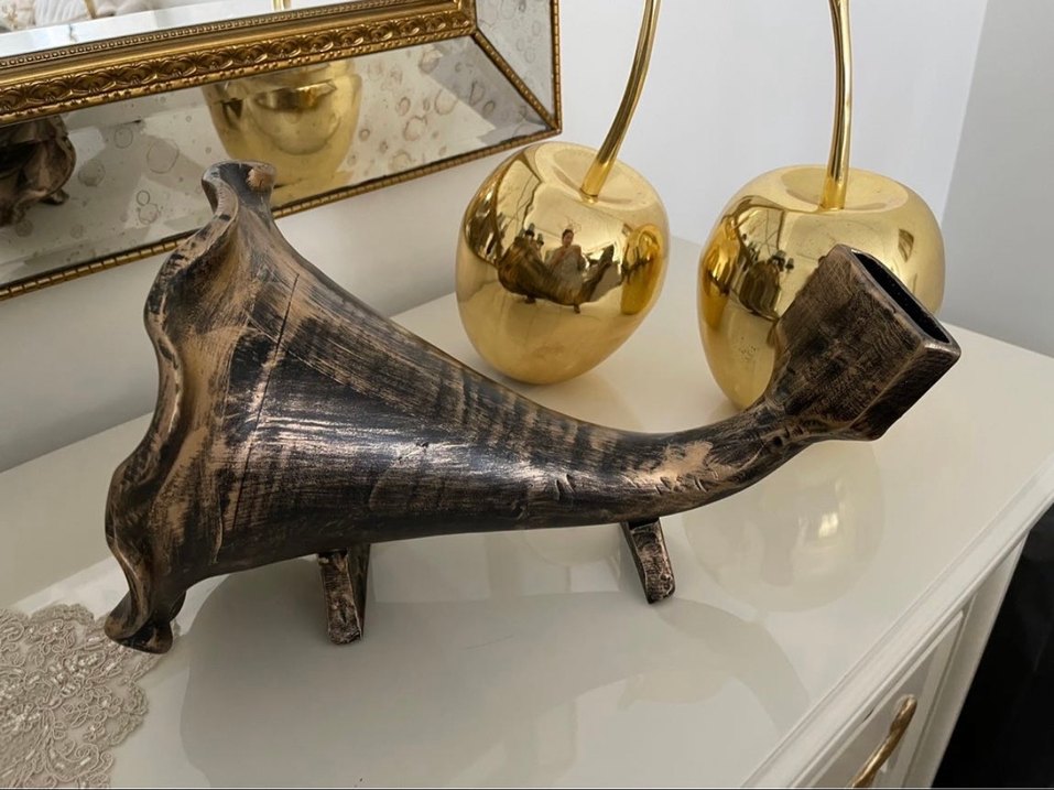 Parlak altın renkte, dekoratif ve şık bir müzik aletidir. Geleneksel tasarım ile parlak bir görünümü bir araya getirir. Ucuna telefon koyulup yüksek sesle müzik dinleniliyor.
