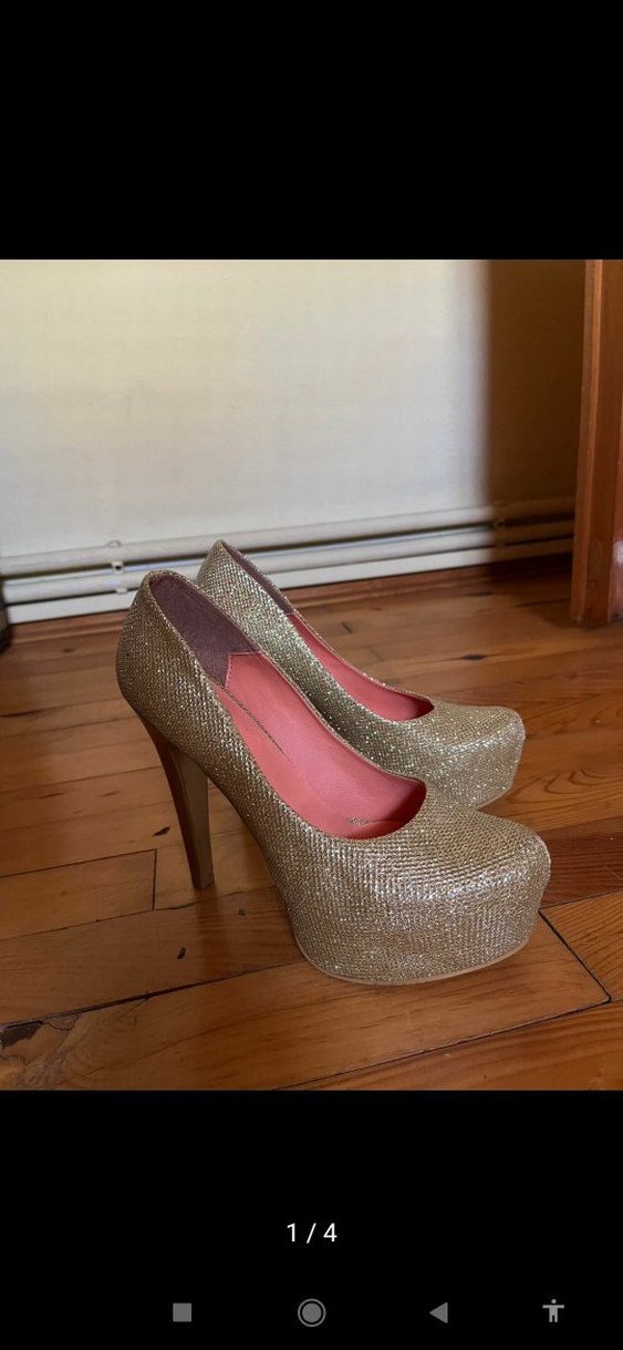 Altın renkli, parlak ışıltılı platform topuklu ayakkabılar, cesur ve çağdaş tasarıma sahip. Romantik akşamlar için uygun, rahat kauçuk tabanlı. ✨ aldım belki olur diye numarası küçük almıştım olmadı o yüzden koyuyorum