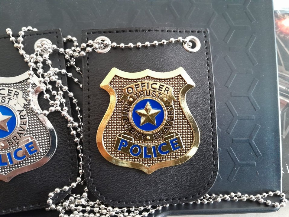 Parlak altın renkli polis rozeti, 'Officer Trust Integrity Bravery' yazılı ve yıldız sembollü, siyah deri zemin ve zincirle beraber. ✨