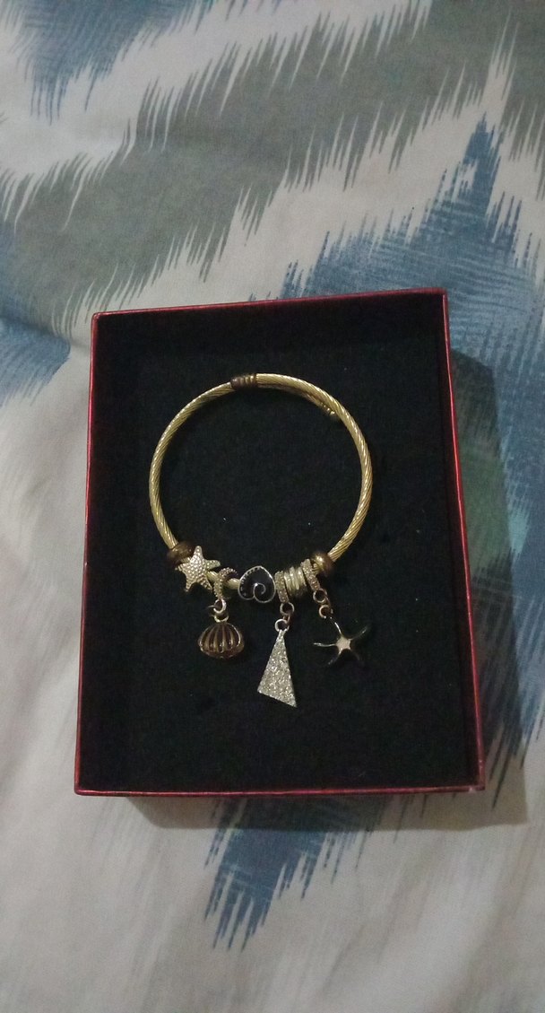 Püsküllü ve parlak görünümlü, yılan desenli altın renk bohem bileklik.