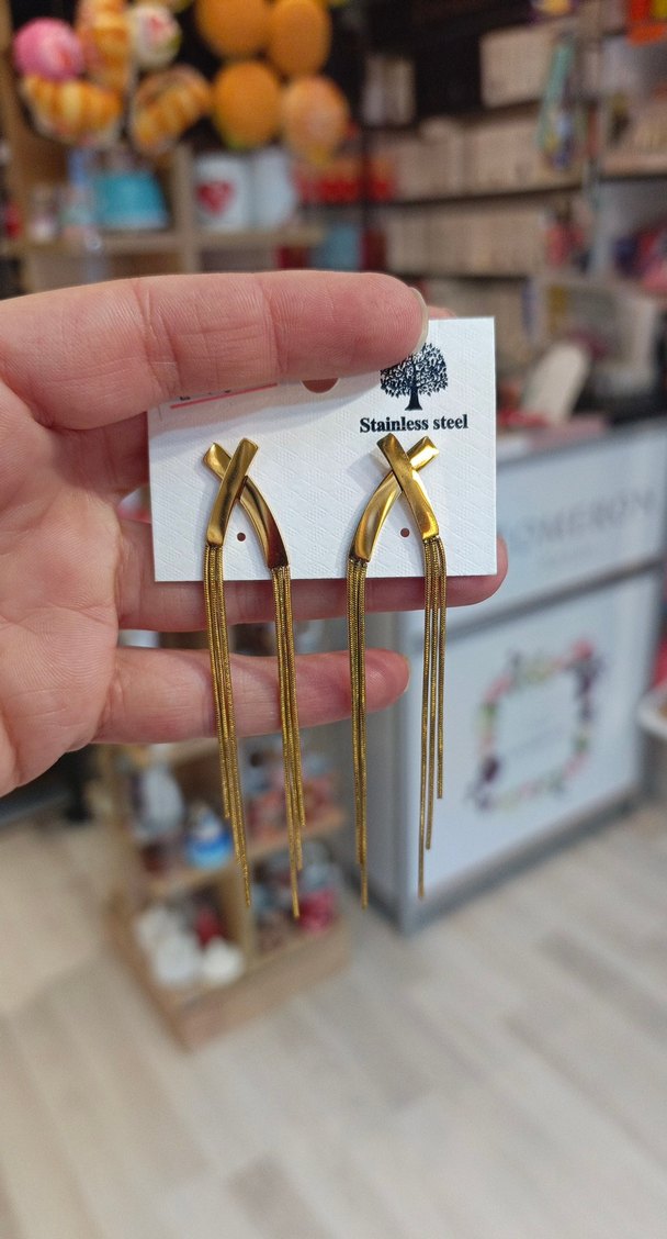 Altın renkli, paslanmaz çelikten kısa püsküllü, bohem ve minimalist stilde günlük kullanıma uygun küpeler. ✨