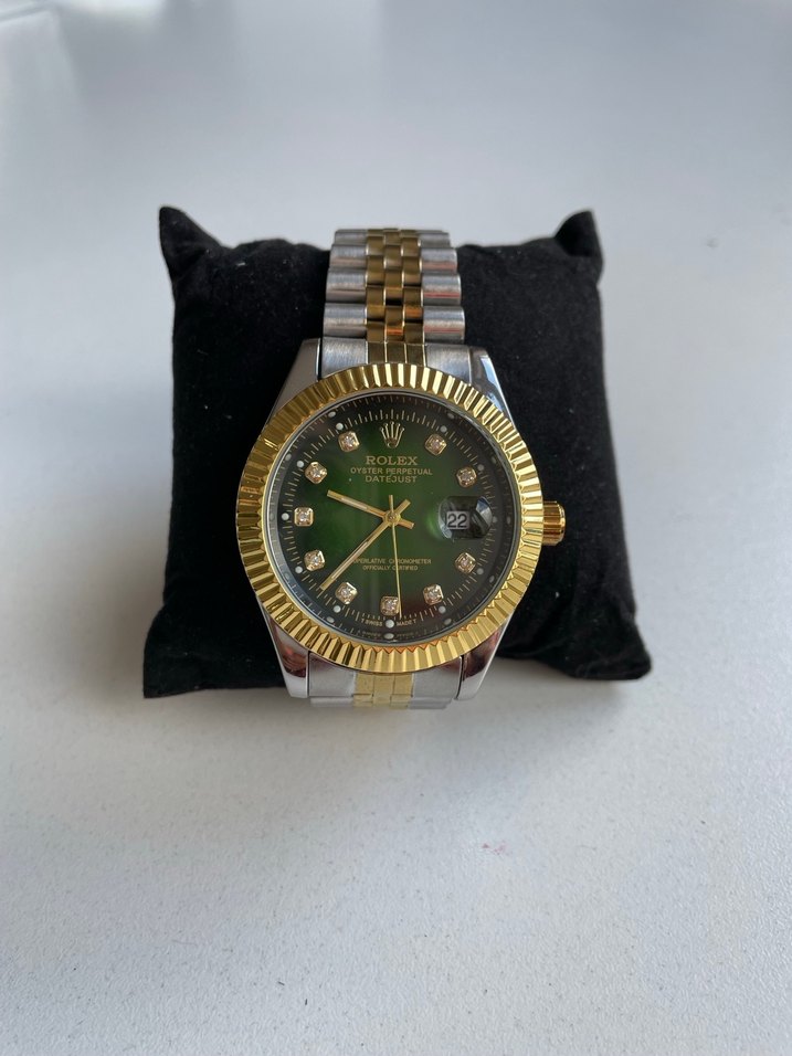 Erkek kol saati, koyu yeşil kadran, altın detaylar ve iki renkli metal bilezikle modern klasik tarzda. Tarih göstergesi ve taşlı saat işaretçileri bulunur. ⌚ Yurtdışından alınmış Rolex marka erkek saatidir.. Kadran içi yeşil, kordonu ise gold ve gümüş rengindedir. Kordon ölçüsü 25 santimdir. Ürün hediye gelmiş olup hiç kullanılmamıştır.