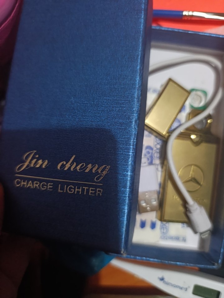 Jin Cheng marka altın renkli şarjlı çakmak, mavi kutu içinde ve USB şarj kablosu ile birlikte gelir. ⚡