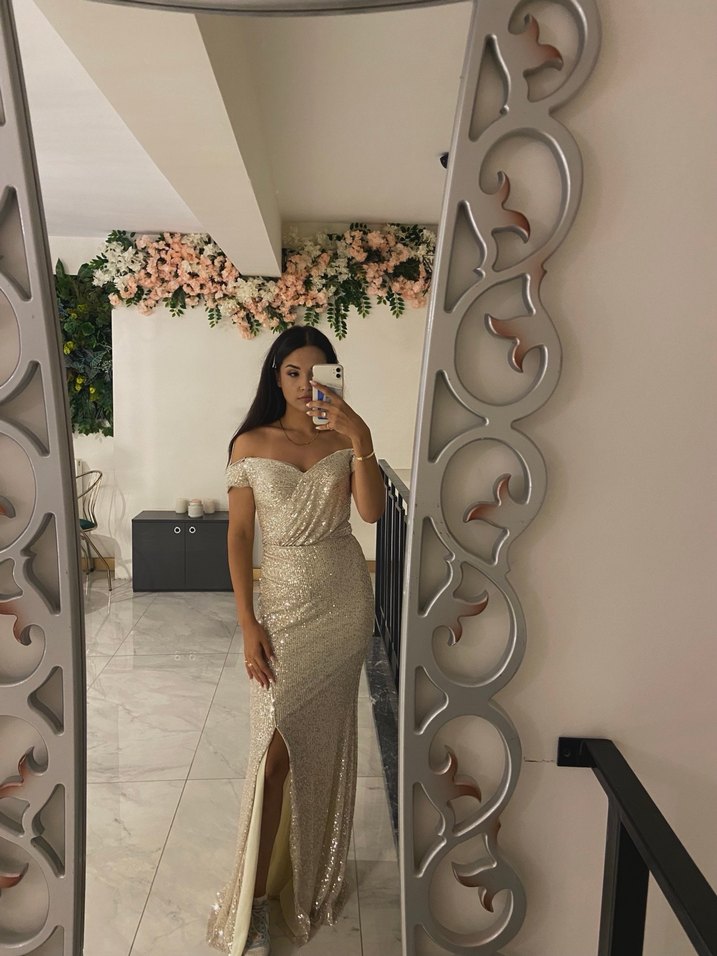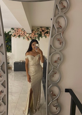 Bu altın renk straplez abiye elbise, drapeli ve uzun kesimlidir. İnce askılı ve yırtmaçlı, klasik zarafet ile bohem tarzı bir arada sunar.