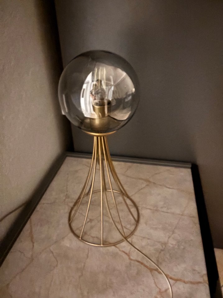 Altın renkli tel taban ve büyük gri cam ampulü ile minimalist ve modern masa lambasıdır. Her mekâna şık bir dokunuş katar. Trendyol fiyatın da bilerek ekledim çizik vs yok