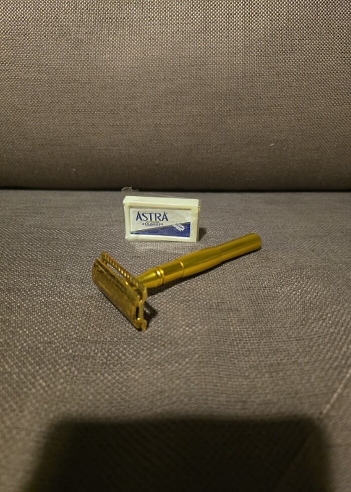 Tıraş aleti, 3 parça, altın renkte. Üst plakanın rengi sterilize ederken değişti. Fiyatı uygun tuttum, fotoğraflarda varken. Kafa ağır, uzun sap hafif, dengeli bir makine. Birkaç kez kullanıldi. Sterimedendo ile dezenfekte edilip gönderilecek. Yanında hediye jiletler de verilecek.