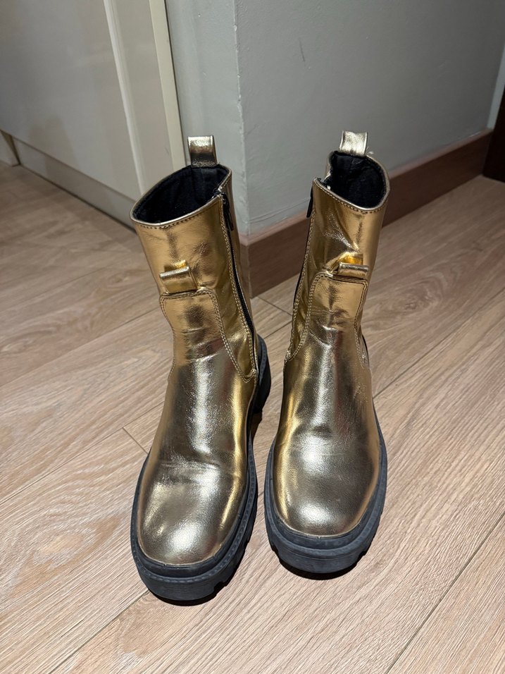 Altın renkli deri kadın botları, tokalı ve blok topuklu. Parlak yüzeyli ve desensiz tasarım, günlük sokak stili için uygun. Defosuz orijinal marka ✨