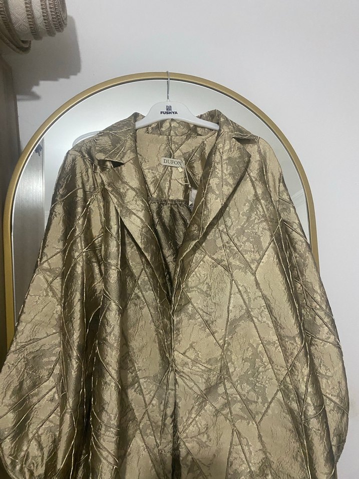 Altın renkli, uzun keten kadın kaban, yakalı ve drapeli tasarıma sahiptir. Uzun kollu, düzenli kesim, ofis ve sokak stili için uygundur. ✨