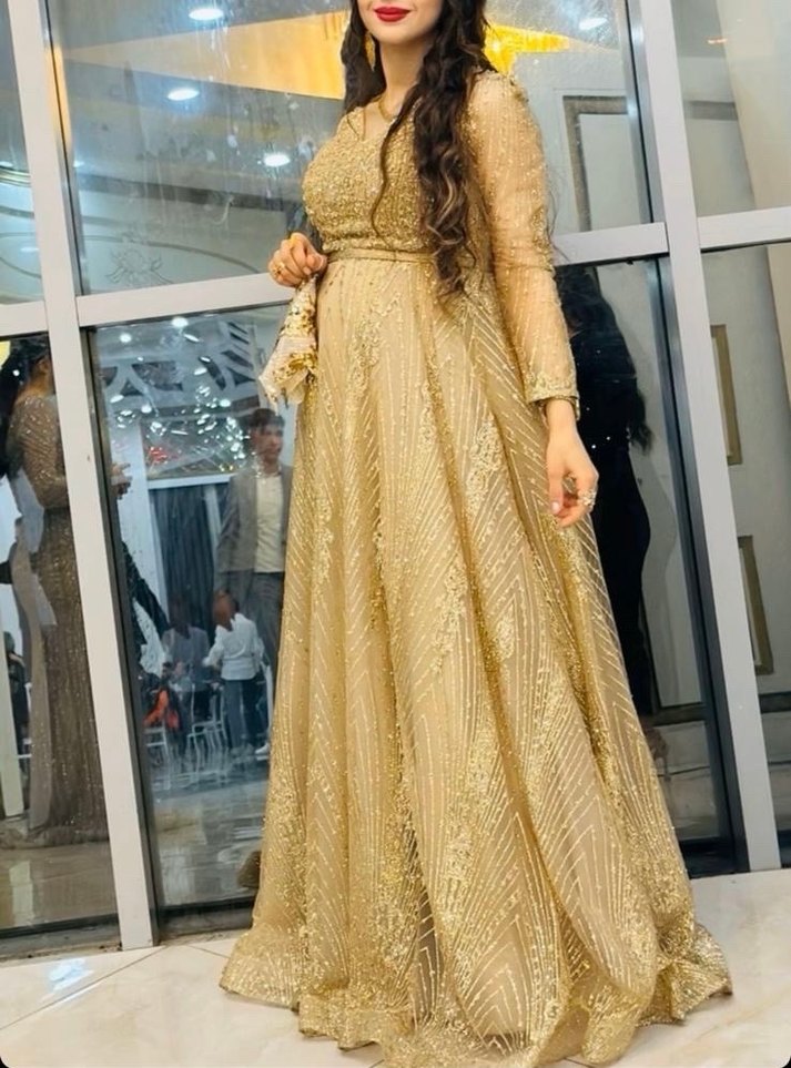 Altın renginde, uzun kollu ve tekne yaka nişan elbisesidir. Düzenli kesim ve drapeli tarzda, parlak işlemeli desenlerle süslenmiştir. Klasik şıklık ve düğünler için uygundur.✨