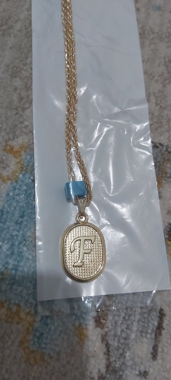 Uzun, detaylı altın renk zincir ve 'F' harfi baskılı parlak kolye ucu bulunan kadın kolyesi. Günlük vintage tarz için uygundur. ✨