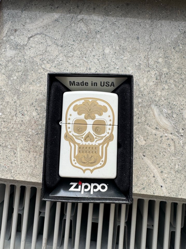 Koyu rock punk havası taşıyan, kafatası desenli altın renk vintage biker rozeti. Üzerinde 'Zippo' ve 'Made in USA' yazısı bulunur. ⚡
