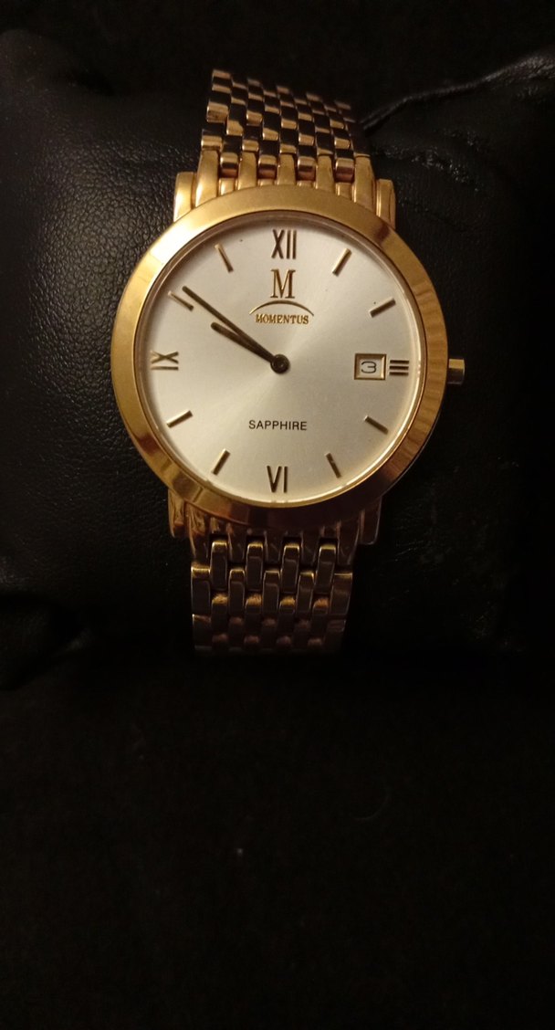 Parlak altın renkli, tokalı kayışlı modern klasik tasarıma sahip erkek saati. Saphire cam ve XII, VI Roma rakamları bulunur. ⌚