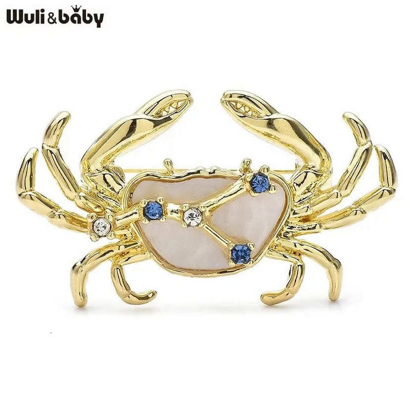 Taşlı, altın renk yengeç şeklinde broş. Romantik akşamlar için bohem tarzda uygun.