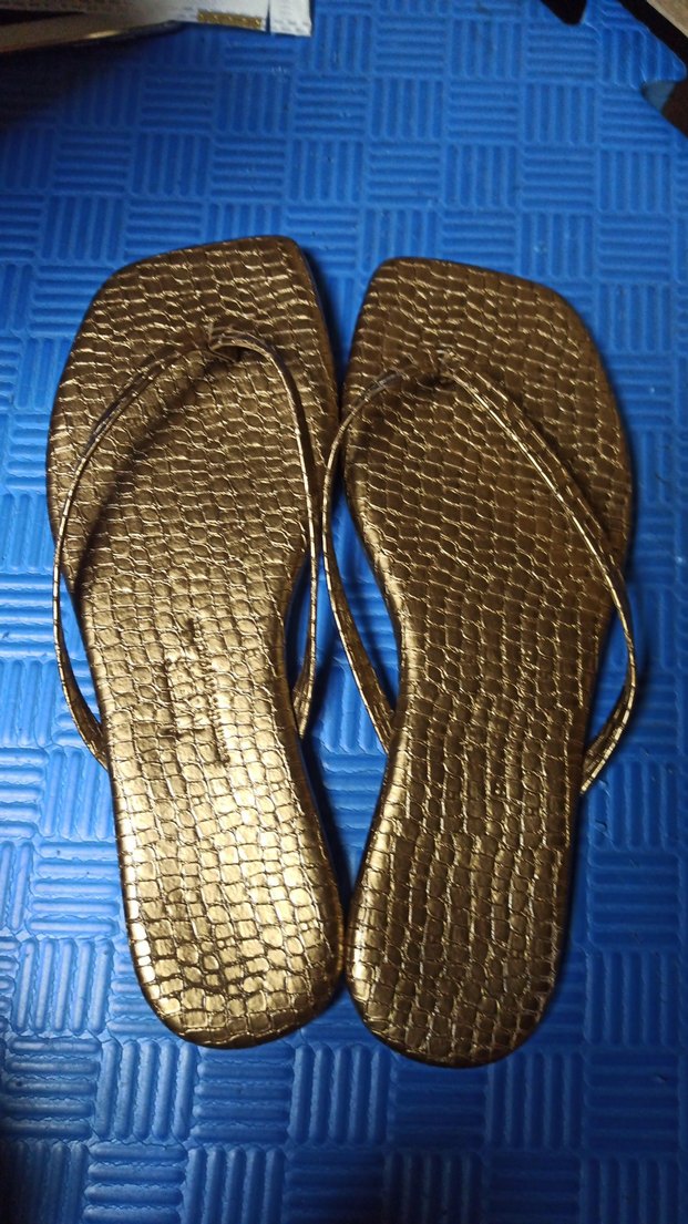 Altın renginde, parlak yılan desenli, terlik ve minimalist bohem tarzıyla plaj için uygundur. 1 kere giyildi terlik torbasida var