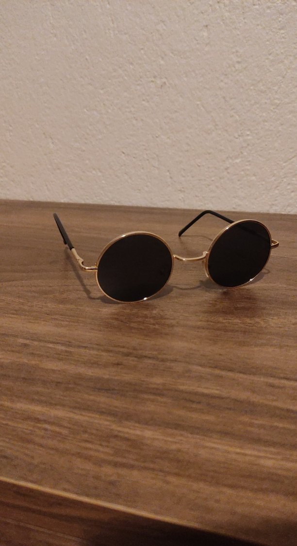 Parlak altın renkli yuvarlak güneş gözlüğü, minimalist çerçevesiyle bohem ve retro tarzı yansıtır, zahmetsiz şıklık sunar. ️