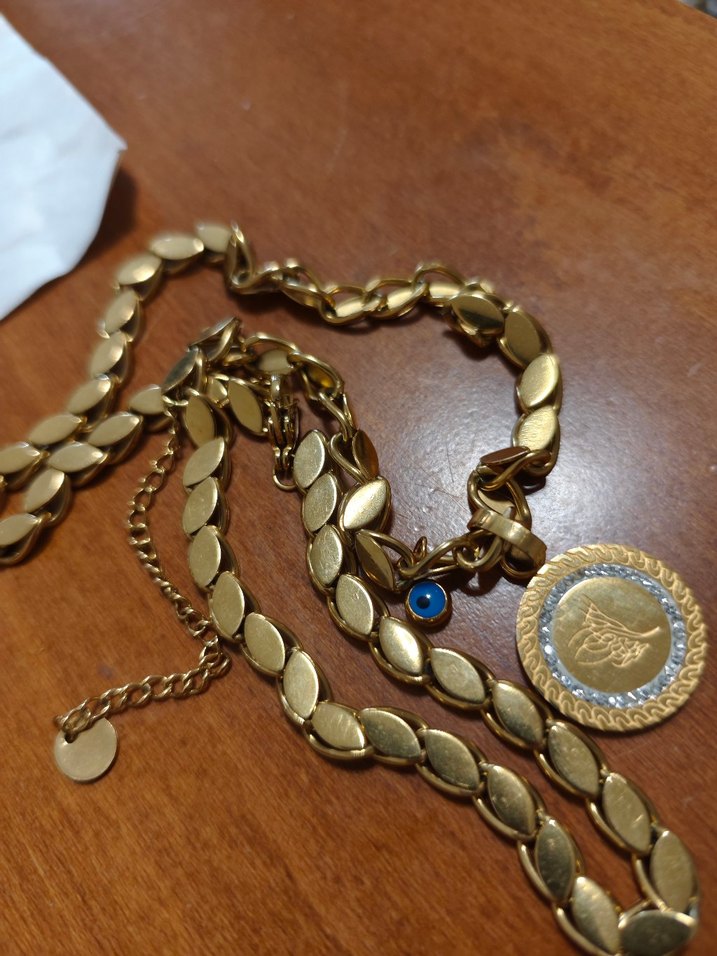 Altın renkli, parlak yılan deseni ve zincir detaylı kadın kolye