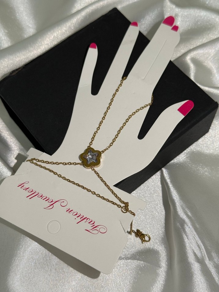Altın renginde, zincir detaylı ve baskılı çiçek motifi bulunan kadın el zinciri. Günlük şıklık için bohem tarzda tasarlanmıştır. ✨ Paslanmaz Çelik Üründür.
