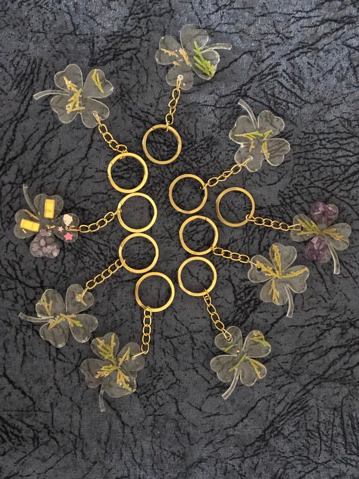 Altın renkli, zincir detaylı ve şeffaf çiçek süslemeli bohem ve avangart tarzda anahtarlıklar.