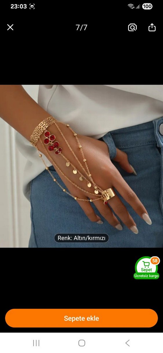 Altın renkli, zincir detaylı bohem kadın el zinciri. Kırmızı aksanlar ve yılan desenli detaylar içerir. Günlük kullanıma uygundur.