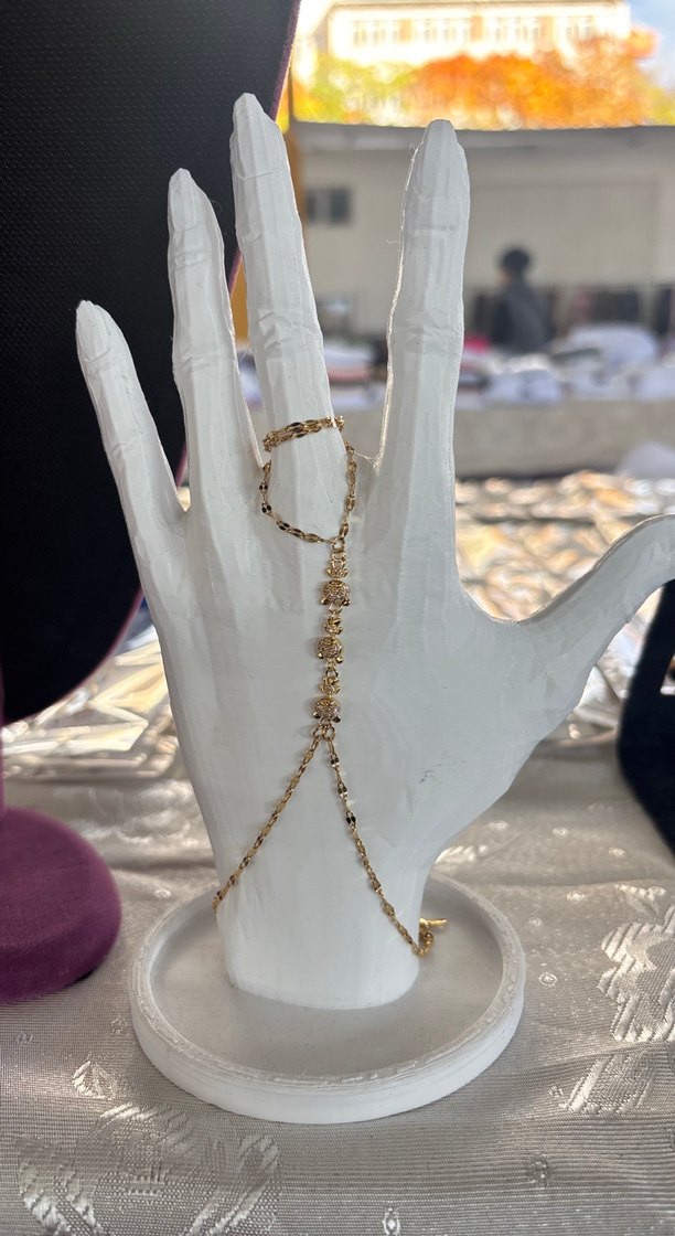 Zincir detaylı ve tedy desenli altın renk el zinciri, bohem tarzını yansıtır. Düğün ve bohem stil sevenler için uygundur.