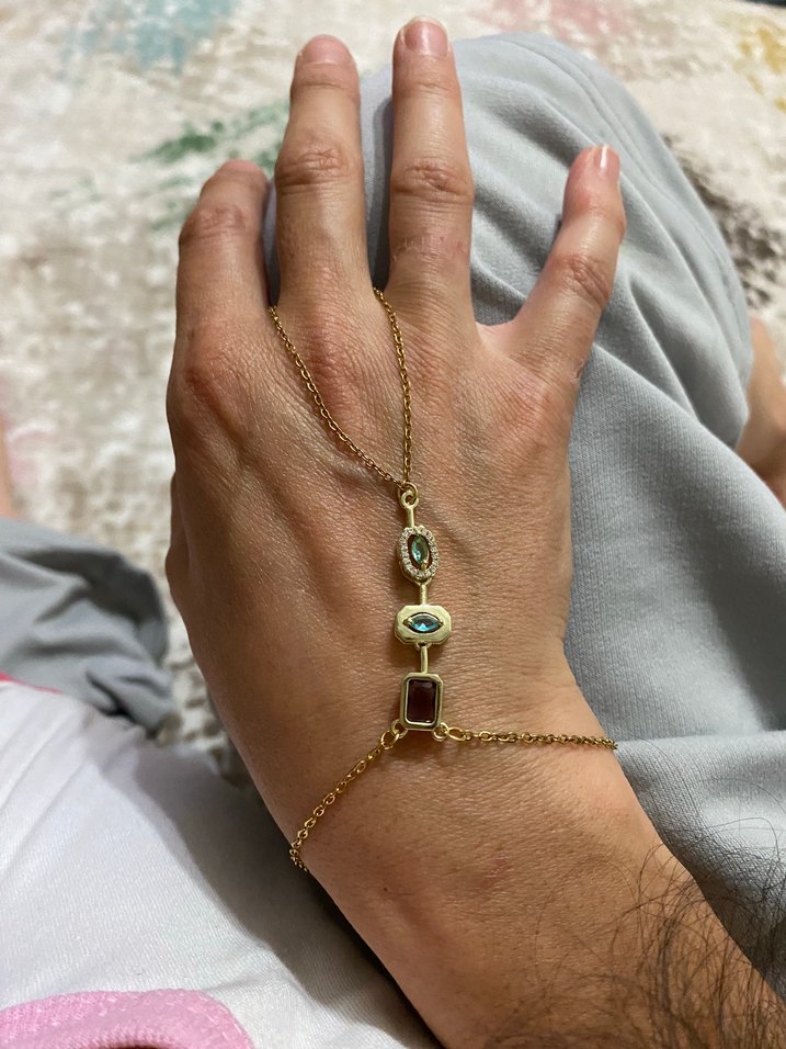 Günlük kullanıma uygun, üç taş detaylı, altın renk zincirden bohem tarzı kadın el zinciri.
