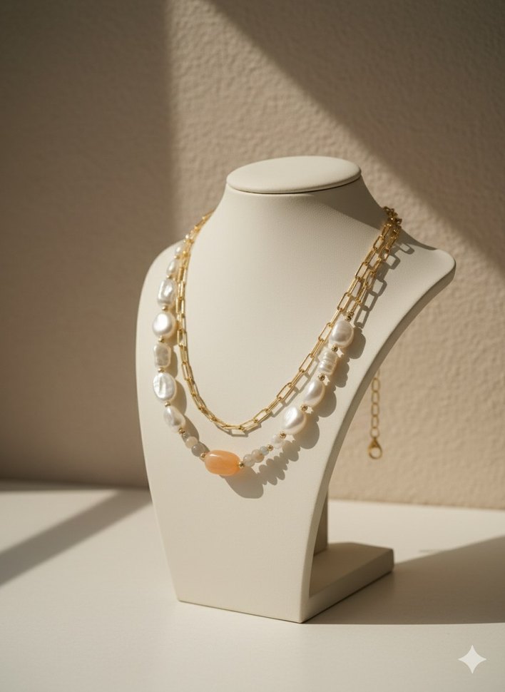 Kısa uzunlukta, altın renk zincir detaylı ve inci görünümlü boncuklarla süslenmiş bohem ve Paris tarzı kadın kolyesi, günlük kullanıma uygundur. ✨