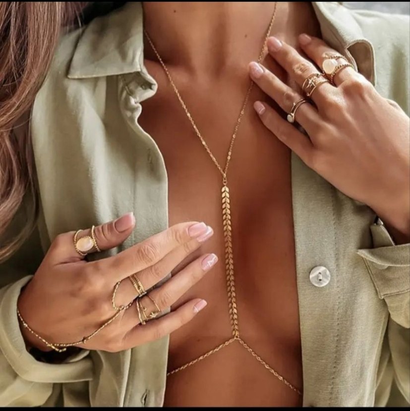 Altın renkli, zincir detaylı ve yılan desenli vücut zinciri, cesur bohem tarzını yansıtır, günlük kullanım için uygundur. ✨