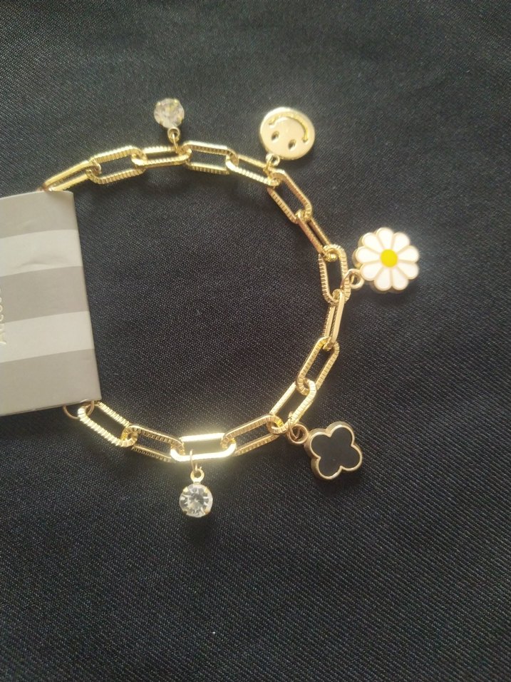 Altın renk zincir bileklik, çiçek ve neşeli figürlerle süslenmiş, günlük kullanım için minimalist ve bohem tarzda.