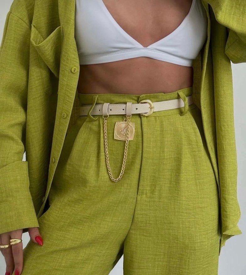 Açık altın renkli deri kemer, zincir ve madalyon detayıyla Paris sokak modasına uygun şık bir tasarım.