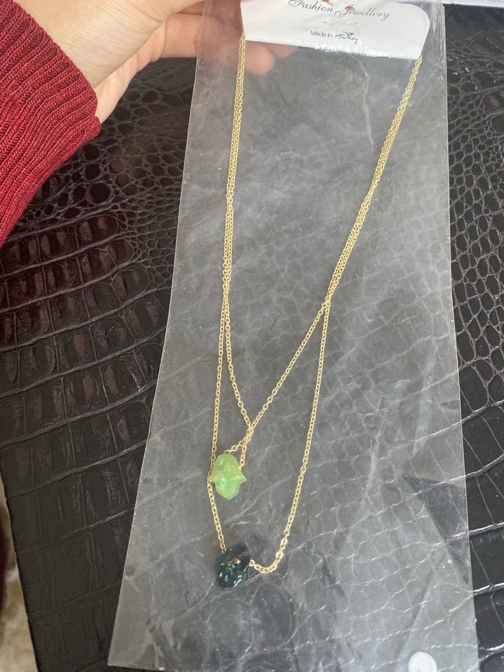 Altın renkli, zincir detaylı, kısa uzunlukta ve desenli minimalist, bohem tarzda günlük kullanıma uygun kolye.