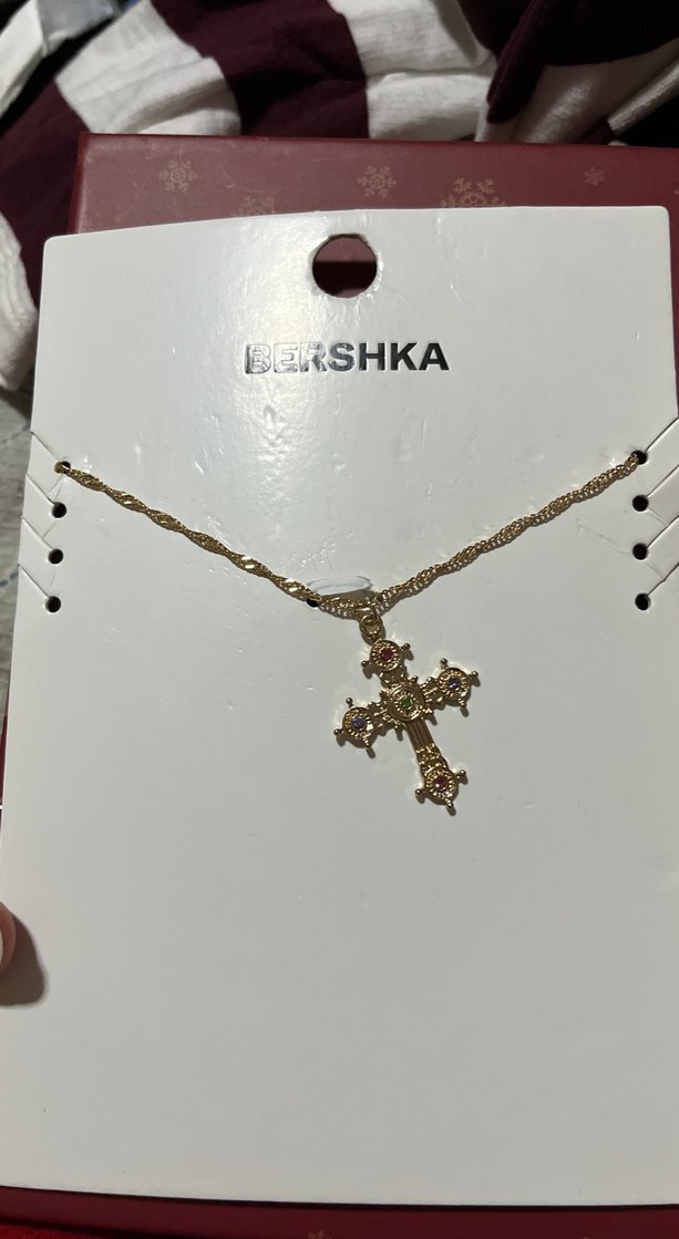 Bershka'dan altın renk zincir detaylı, işlemeli gotik haç kolye. Koyu canlı renklerle günlük kullanıma uygun, bohem ve retro tarzda. ✨