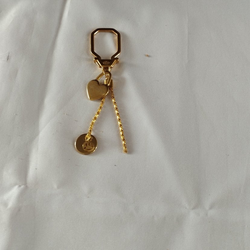 Altın renkli, zincir detaylı kadın anahtarlık, kalp ve gülen yüz figürlü sade ve parlak sokak stili aksesuar. ✨