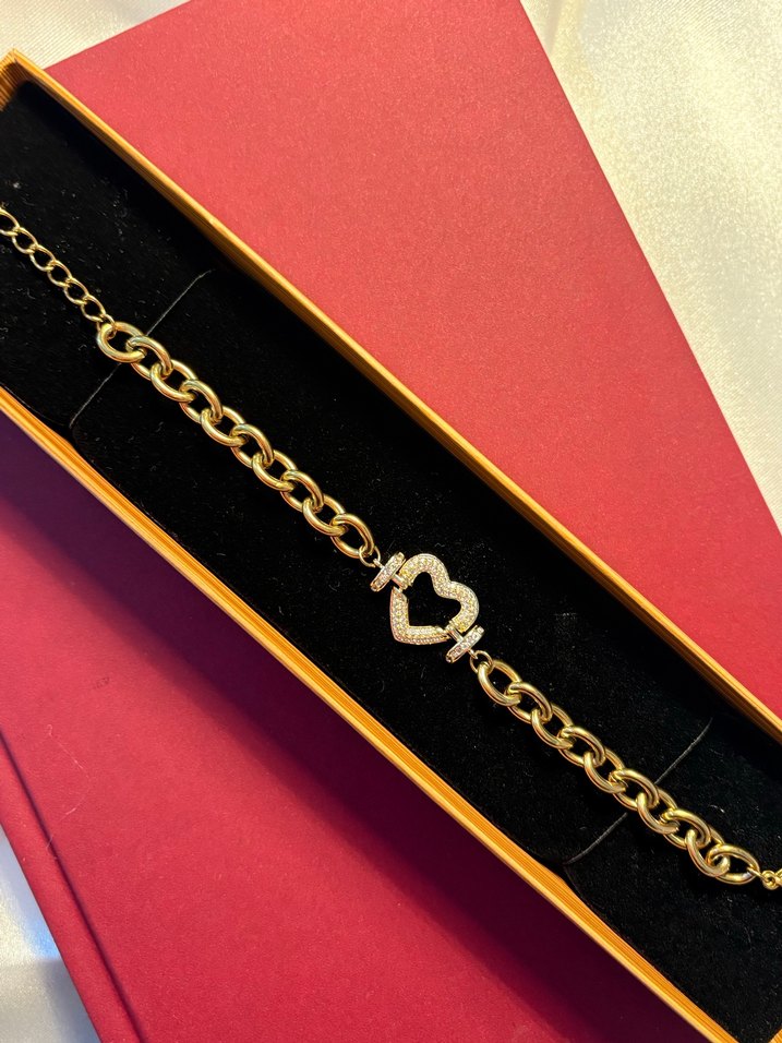 Altın renkli, zincir detaylı kadın bileklik, kristalli kalp figürü ile romantik akşamlar için uygun.