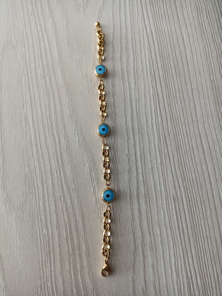 Mavi göz figürlü, parlak altın renk zincir detaylı bileklik. Minimalist ve bohem tarzı birleştirir, sade günlük kullanım için uygundur.