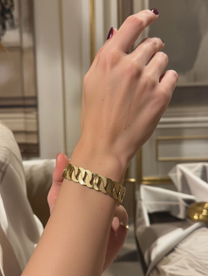 Zincir detaylı, parlak altın renkli kadın bileklik. Yılan deseni ve cesur Paris tarzını yansıtan çağdaş tasarım, günlük kullanıma uygundur.