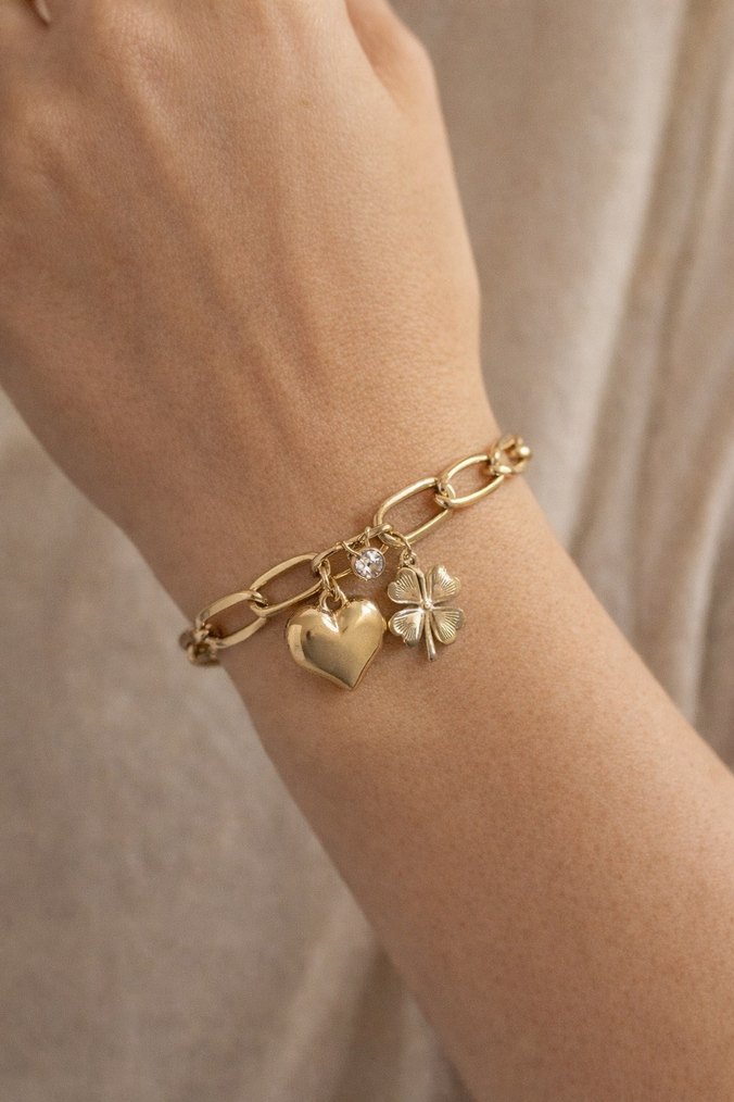 Altın renk zincir bileklik, kalp ve yonca figürlü detaylarla günlük kullanıma uygun hafif ve şık tasarım.
