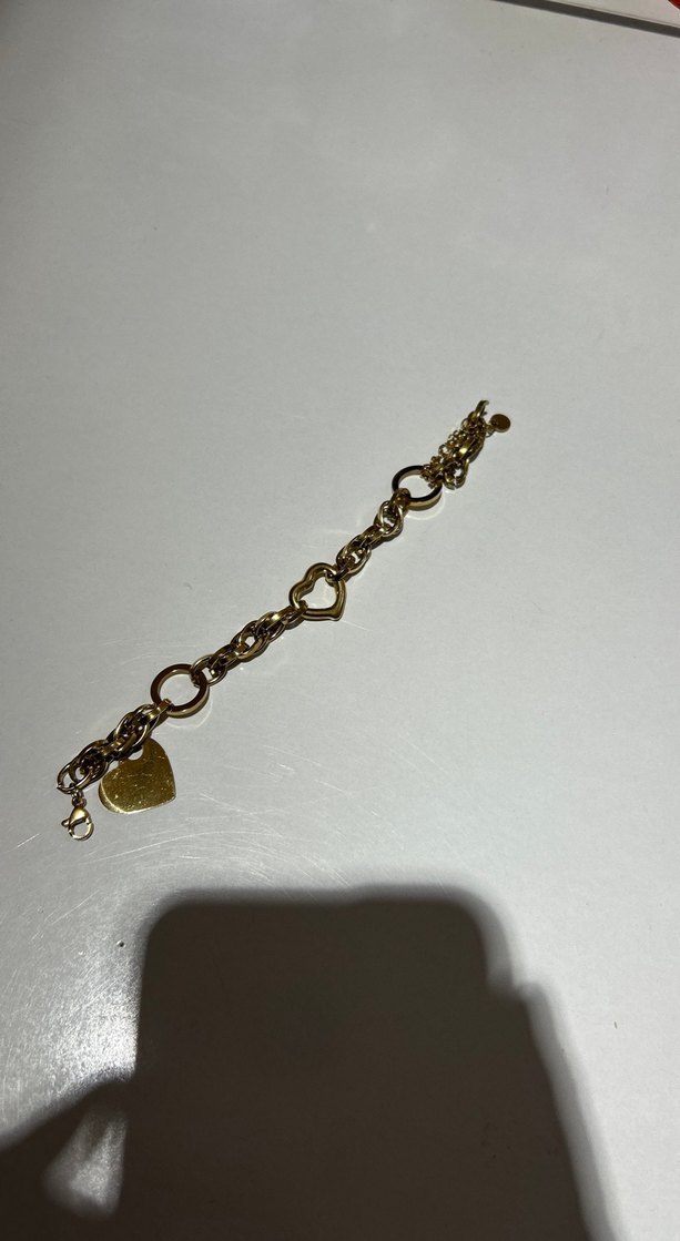Parlak altın renkli, zincir detaylı ve kalp figürlü bu bileklik, romantik akşamlar için ideal, minimal ve bohem tarzda.