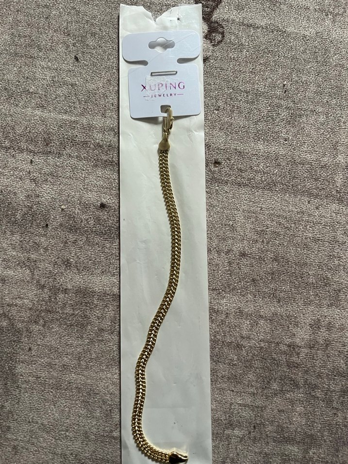 Parlak altın renkli, yılan desenli zincir detaylı kadın bileklik. Günlük kullanım için uygundur. Marka: XUPING.